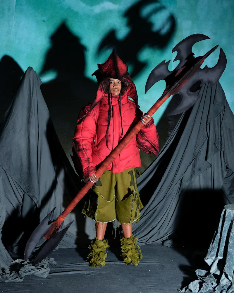 However, the main focal point was the performance space. An otherworldly land had been built with cloth-covered rocks and wood pipes playing in the background. This was where the clothes were displayed. Yaku chose to use actors rather than models to present his garments as he wanted the characters that the actors represented to be as important as the clothes they wore. It was explained that each look was embodying a different member of his family, hence the necessity of actors. These ‘characters’ are not new to the Yaku universe but it was made clear that AW25 is the family’s final day before they enter the unknown.